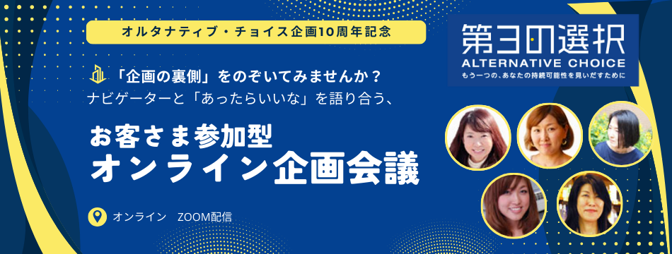 ということで、初開催するオルタナティブ・チョイス オンラインミーティングにも皆様のご参加をお待ちしております。私はおしゃべりなので、オルタナ企画をスタートしたときの裏話もうっかりポロッとしちゃうかもしれません(笑)。