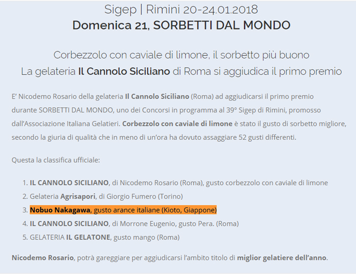 聞くところによると過去この協会のコンテストで、大手企業ではない完全に個人ベースの日本人のジェラート職人がトップ3に入ったことは過去2回しかなく、中川は3人目のようです。