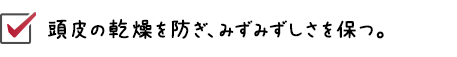 オレイン酸は保湿力が高く、蒸発しにくいサラサラとした脂肪酸です。人の肌に潤いを与える皮脂の組成を見てみると、最も多く含まれているのがこのオレイン酸で、皮脂全体の41%を占めます。髪や肌になじみやすく、親和性の高いオイルであると言えるでしょう。椿オイルは、痛んだ髪のキューティクルをコーティングし、内部の水分を閉じ込めます。枝毛や切れ毛、パサつきを保護し、潤いと艶のある髪へと導きます。