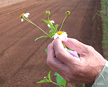 キク科センダングサ属の植物で和名はタチアワユキセンダングサ。株式会社武蔵野免疫研究所を中心とする企業グループ「むさしのイミュニティーグループ」が農薬・化学肥料・たい肥を一切使用せずに栽培を行っています。甘やかさず育てる独自の農法により、植物自身が宮古島の珊瑚由来のミネラル豊富な土壌にしっかりと根を張り、たくましく育ちます。