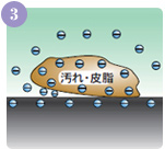 (-)イオンに取り囲まれた汚れは、小さく分離され、一部は乳化されたり、油分は水石けん化することで汚れ落としの手助けをします。