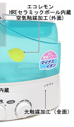 「青い白鳥」の外側全体に光触媒加工、タンク内のエコレモンには空気触媒加工と呼ばれる新しい技術を取り入れています。エコレモンの中の活性石は波動イオン水を作ります。また、「イオO2」「青い白鳥」に内蔵された銀イオンは特に抗菌作用があります。ペットのニオイも消えます。