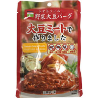 大豆を主原料とし、たまねぎやキャベツ等野菜を加えたお肉を使わないハンバーグをトマトソースで味付けしました。