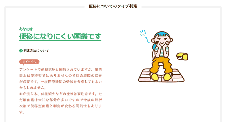 アンケートで「便秘気味」と回答したら、それについて私の腸内細菌叢からのタイプ判定と「あなたへの改善プラン」として、食生活や睡眠などのアドバイスがありました。自分の体のことですがどんな細菌叢が多くて、どんな状態かなどは中々わかるものではないので、一つの目安として検査をしてみるのは良いかもしれません。私自身はしばらく腸活をした後にどのような変化が起こっているかをまた検査してみたいと思います。