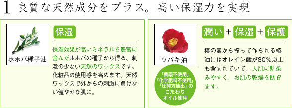 アロエベラ葉エキス・ヒマシ油・ホホバオイルが肌を乾燥から防ぎ、しっとり潤いを与えます。
