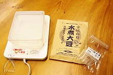 発芽玄米やヨーグルトがつくれるなら、当然、発酵食品の納豆も作れるでしょう! 使用したのは、本器(楽らく発芽)と宮城白目水煮大豆1袋、それから6倍活性納豆菌1個。 いざ!納豆づくり開始!