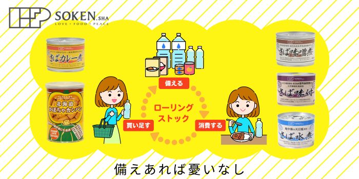 ローリングストックとは、賞味期間の長い缶詰やカンパンなどの防災食を