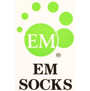 EMとはEffective(有用)Microorganisms(微生物)の略語で、人間に役立つ微生物(光合成細菌・酵母・乳酸菌・放線菌など)の集まりです。最初は農薬を中心とした近代農業の矛盾を解決する目的で開発されましたが、最近では環境・工業・資源サイクル・健康分野にも応用され、世界中で注目を集めている無味無臭に近い透明な黄金色の液体です。 杉山ニット工業はこの「EM・X GOLD」を繊維に含有させる特殊技術を用い、くつ下製造を行っています。