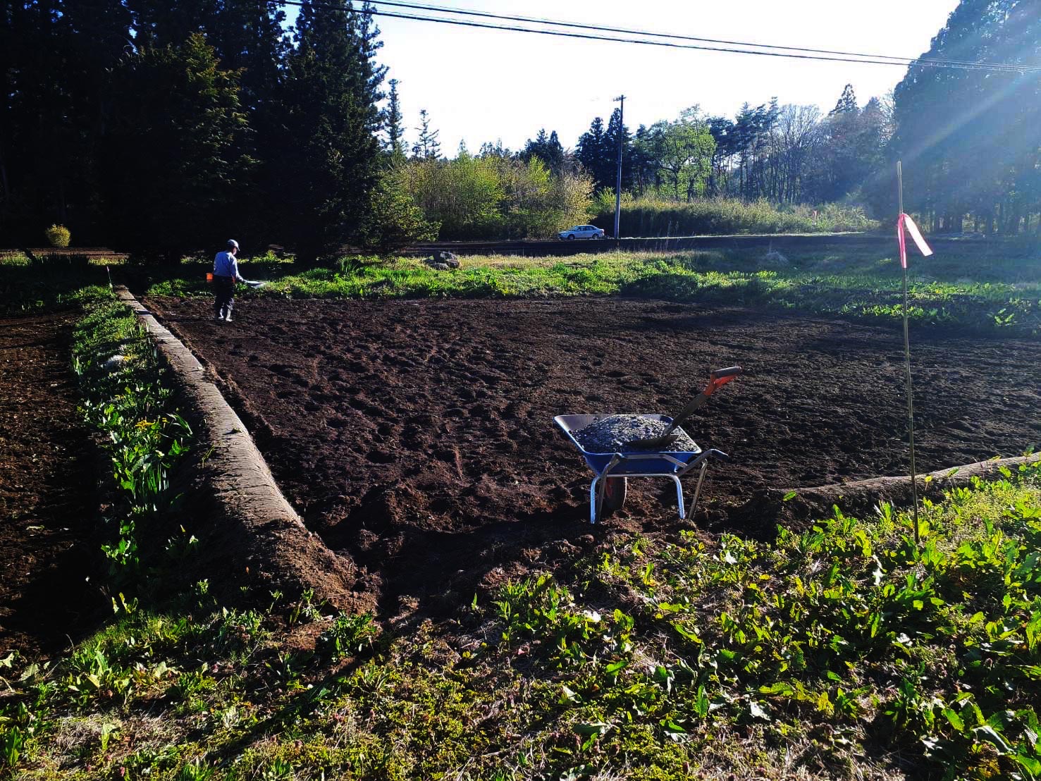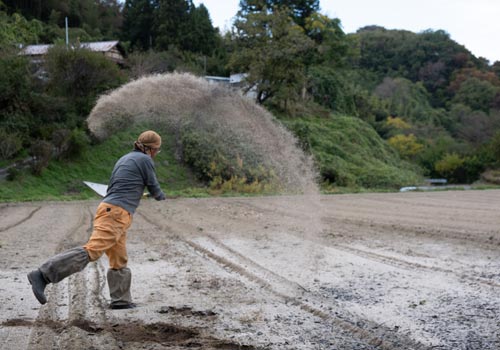 田おこし前に有機肥料(竹炭と牡蠣殻、有機牛糞完熟堆肥を独自ブレンド)を散布します。