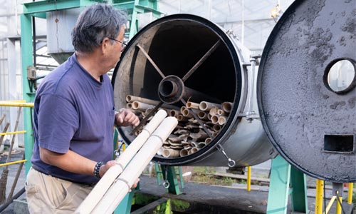 化学燃料を使わず、環境にやさしく竹炭を生産できる自燃式炭化装置「還炭(かんたん)くん」の2号機を導入し、生産効率の向上と生産開発を加速させることを目指します。
