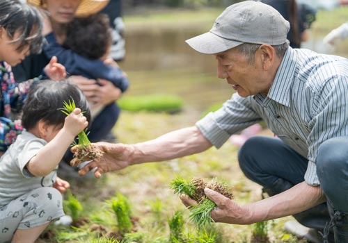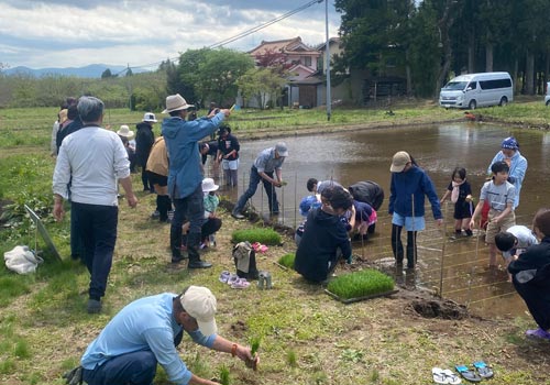 心をこめて苗を植えます。地域の方や子どもたちといっしょに田植えをすることも。農業体験も定期的に開催していきたいと思っています。