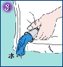 | 1・枕をイスの上に立てて置き、キャップを外します。 | 2・給水口を親指と他の指で挟み、上方にむけます。 | 3・給水口を挟んだまま人差し指を穴の中に入れ、水袋に水を入れやすくします。 | 4・じょうろ、ペットボトル、やかんなどを使い注意深く水を入れます。 |