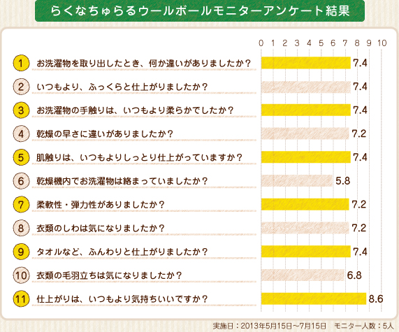 今回モニターをお願いしたのは、化学合成された洗濯洗剤や柔軟剤の代わりにナチュラルな洗濯石けん等、ナチュラルなお洗濯をほぼ毎日の日課にされている皆様です。モニターの皆様には、いつものお洗濯方法はそのままに、衣類乾燥機を使用し、その際にらくなちゅらるウールボールを一緒に入れて頂くようお願いしました。5~10回連続で試した後、使い心地がどうだったか感想をお聞きしました。
